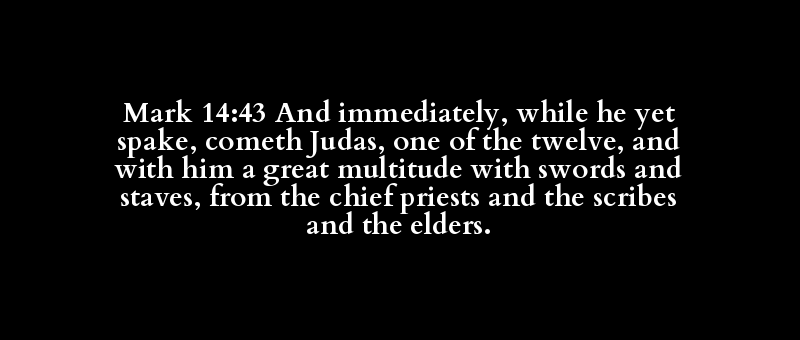 | [kai] | [eutheos] | [autos] | [eti] | [laleo] | [paraginomai] | [Ioudas] | [on] | [heis] | [dodeka] | [kai] | [meta] | [autos] | [polus] | [ochlos] | [meta] | [machaira] | [kai] | [xulon] | [para] | [archiereus] | [kai] | [grammateus] | [kai] | [presbuteros] |