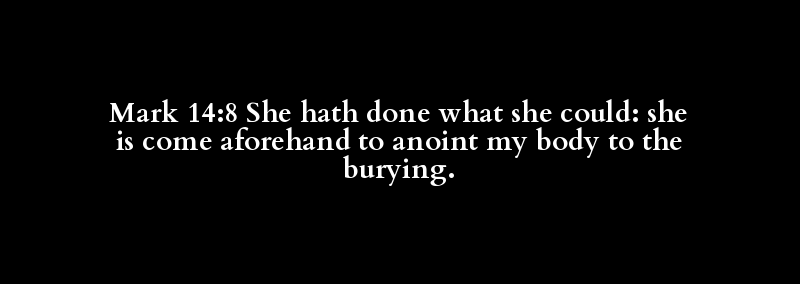 Mark 14:8 She hath done what she could: she is come aforehand to anoint my body to the burying.