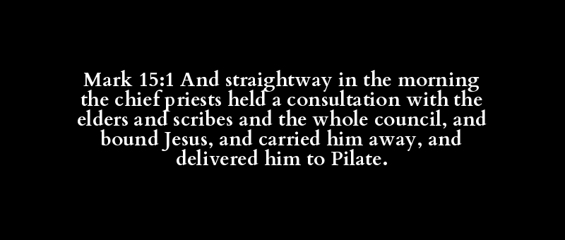 Mark 15:1 And straightway in the morning the chief priests held a consultation with the elders and scribes and the whole council, and bound Jesus, and carried him away, and delivered him to Pilate.