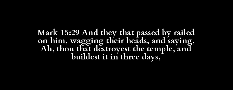 Mark 15:29 And they that passed by railed on him, wagging their heads, and saying, Ah, thou that destroyest the temple, and buildest it in three days,