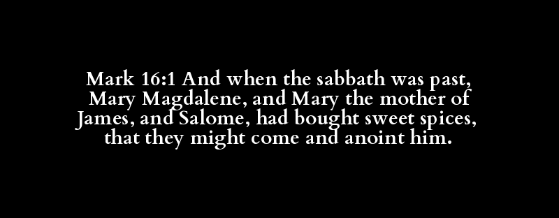 Mark 16:1 And when the sabbath was past, Mary Magdalene, and Mary the mother of James, and Salome, had bought sweet spices, that they might come and anoint him.