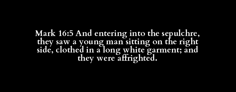 Mark 16:5 And entering into the sepulchre, they saw a young man sitting on the right side, clothed in a long white garment; and they were affrighted.