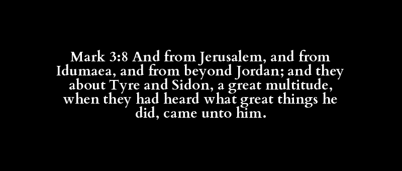 Mark 3:8 And from Jerusalem, and from Idumaea, and from beyond Jordan; and they about Tyre and Sidon, a great multitude, when they had heard what great things he did, came unto him.