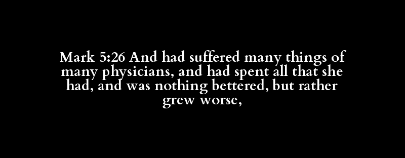 Mark 5:26 And had suffered many things of many physicians, and had spent all that she had, and was nothing bettered, but rather grew worse,