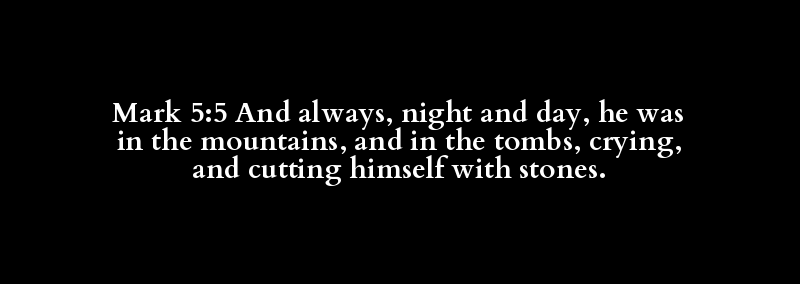 Mark 5:5 And always, night and day, he was in the mountains, and in the tombs, crying, and cutting himself with stones.