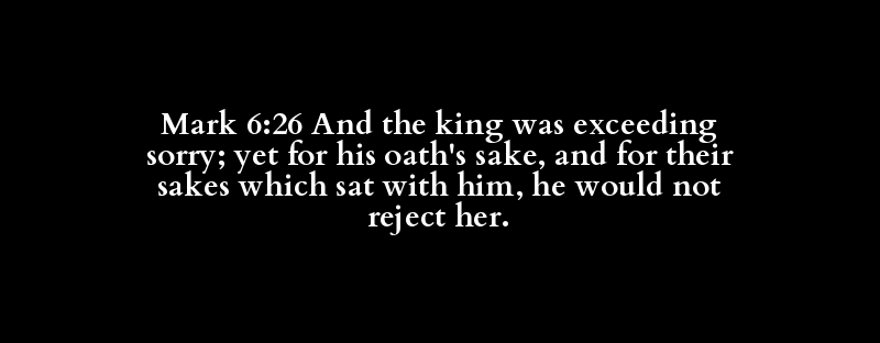 Mark 6:26 And the king was exceeding sorry; yet for his oath's sake, and for their sakes which sat with him, he would not reject her.