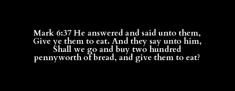| [apokrinomai] | [de] | [epo] | [autos] | [didomi] | [humeis] | [autos] | [phago] | [kai] | [lego] | [autos] | [aperchomai] | [agorazo] | [diakosioi] | [denarion] | [artos] | [kai] | [didomi] | [autos] | [phago] |