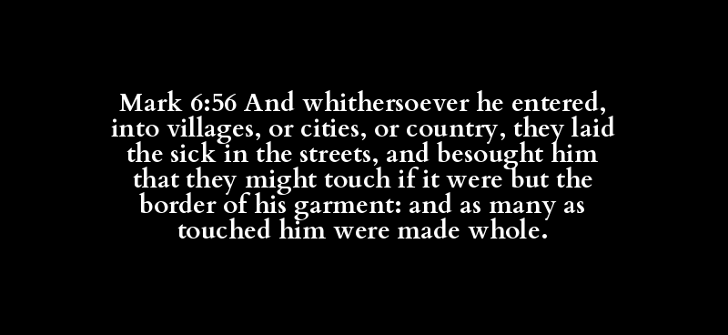 Mark 6:56 And whithersoever he entered, into villages, or cities, or country, they laid the sick in the streets, and besought him that they might touch if it were but the border of his garment: and as many as touched him were made whole.
