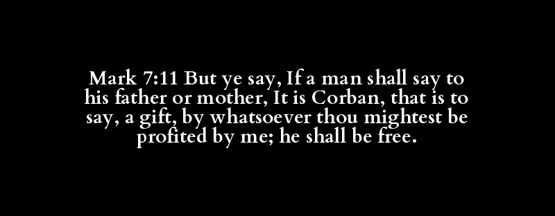 Mark 7:11 But ye say, If a man shall say to his father or mother, It is Corban, that is to say, a gift, by whatsoever thou mightest be profited by me; he shall be free.