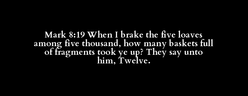 Mark 8:19 When I brake the five loaves among five thousand, how many baskets full of fragments took ye up? They say unto him, Twelve.