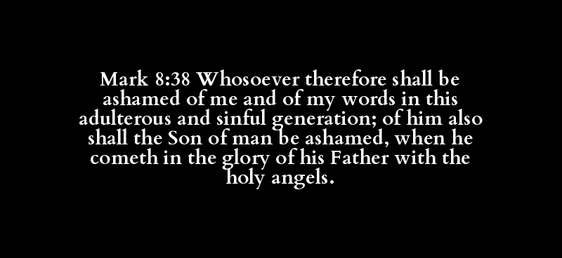 Mark 8:38 Whosoever therefore shall be ashamed of me and of my words in this adulterous and sinful generation; of him also shall the Son of man be ashamed, when he cometh in the glory of his Father with the holy angels.