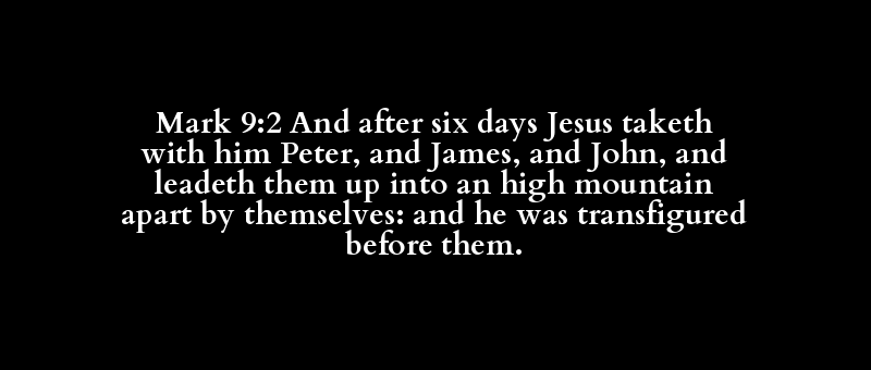 Mark 9:2 And after six days Jesus taketh with him Peter, and James, and John, and leadeth them up into an high mountain apart by themselves: and he was transfigured before them.