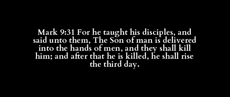 Mark 9:31 For he taught his disciples, and said unto them, The Son of man is delivered into the hands of men, and they shall kill him; and after that he is killed, he shall rise the third day.