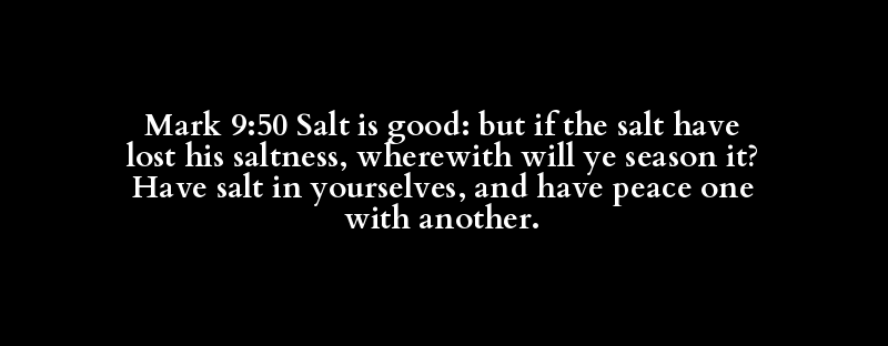Mark 9:50 Salt is good: but if the salt have lost his saltness, wherewith will ye season it? Have salt in yourselves, and have peace one with another.