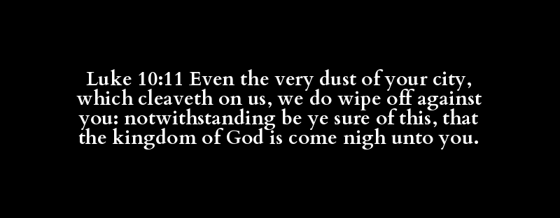 Luke 10:11 Even the very dust of your city, which cleaveth on us, we do wipe off against you: notwithstanding be ye sure of this, that the kingdom of God is come nigh unto you.