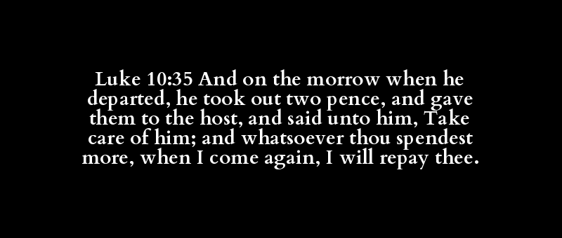 | [kai] | [epi] | [aurion] | [exerchomai] | [ekballo] | [duo] | [denarion] | [didomi] | [pandocheus] | [kai] | [epo] | [autos] | [epimeleomai] | [autos] | [kai] | [an] | [hostis] | [prosdapanao] | [me] | [epanerchomai] | [en] | [ego] | [apodidomi] | [soi] |