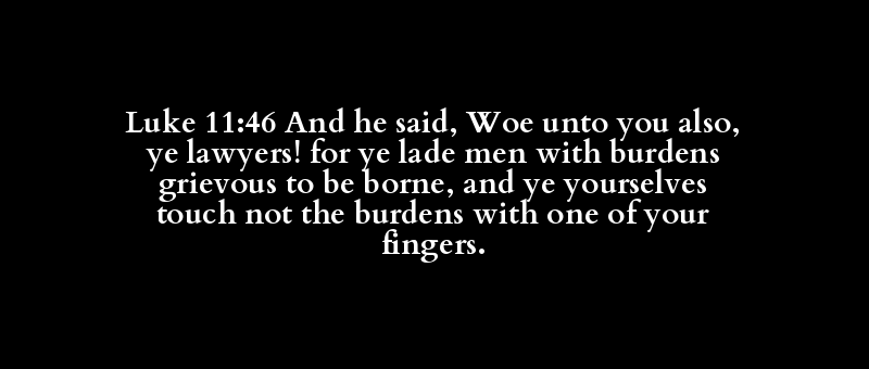 Luke 11:46 And he said, Woe unto you also, ye lawyers! for ye lade men with burdens grievous to be borne, and ye yourselves touch not the burdens with one of your fingers.