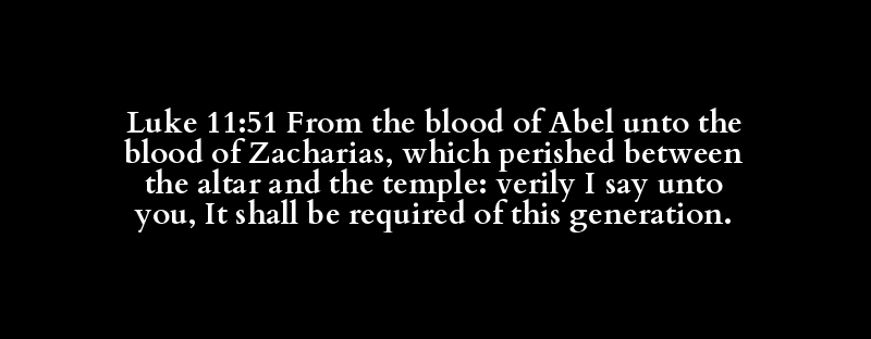 | ἀπό | αἷμα | Ἄβελ | ἕως | αἷμα | Ζαχαρίας | ὁ | ἀπόλλυμι | μεταξύ | θυσιαστήριον | καί | οἶκος | ναί | λέγω | ὑμῖν | ἐκζητέω | ἀπό | ταύτῃ | γενεά |