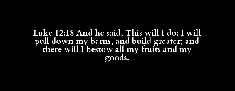 Luke 12:18 And he said, This will I do: I will pull down my barns, and build greater; and there will I bestow all my fruits and my goods.
