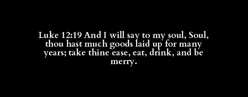 Luke 12:19 And I will say to my soul, Soul, thou hast much goods laid up for many years; take thine ease, eat, drink, and be merry.