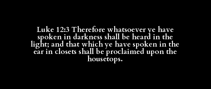 Luke 12:3 Therefore whatsoever ye have spoken in darkness shall be heard in the light; and that which ye have spoken in the ear in closets shall be proclaimed upon the housetops.