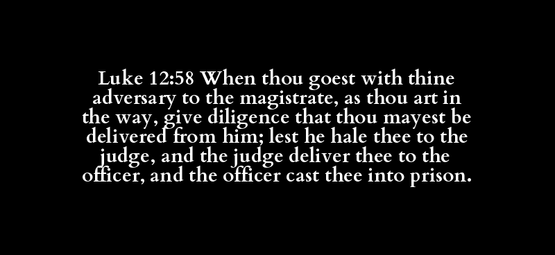 | γάρ | ὡς | ὑπάγω | μετά | σοῦ | ἀντίδικος | ἐπί | ἄρχων | ἐν | ὁδός | δίδωμι | ἐργασία | ἀπαλλάσσω | ἀπό | αὐτός | μήποτε | κατασύρω | σέ | πρός | κριτής | καί | κριτής | παραδίδωμι | σέ | πράκτωρ | καί | πράκτωρ | βάλλω | σέ | εἰς | φυλακή |