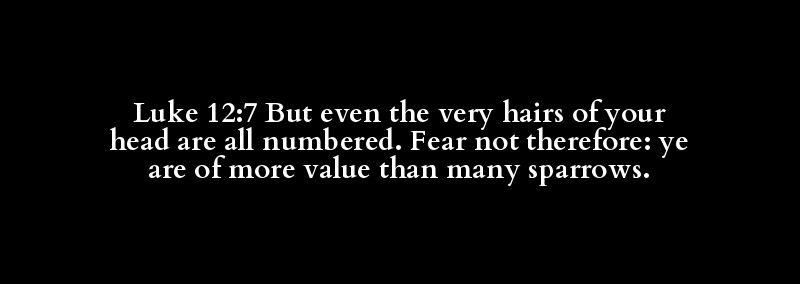 Luke 12:7 But even the very hairs of your head are all numbered. Fear not therefore: ye are of more value than many sparrows.