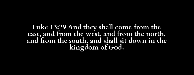 Luke 13:29 And they shall come from the east, and from the west, and from the north, and from the south, and shall sit down in the kingdom of God.