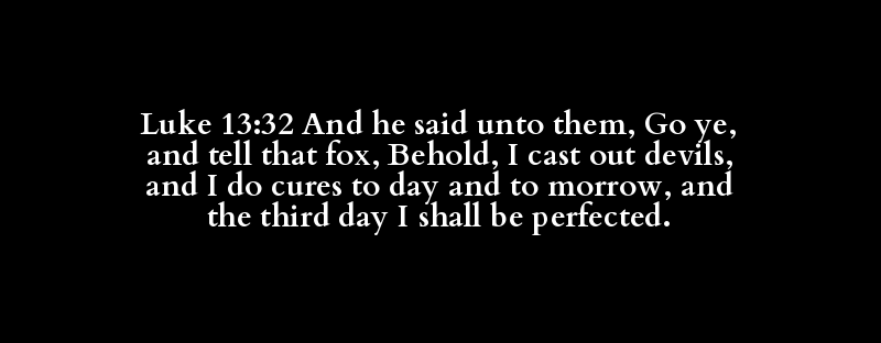 | καί | ἔπω | αὐτός | πορεύομαι | ἔπω | ταύτῃ | ἀλώπηξ | ἰδού | ἐκβάλλω | δαιμόνιον | καί | ἐπιτελέω | ἴασις | σήμερον | καί | αὔριον | καί | τρίτος | τελειόω |