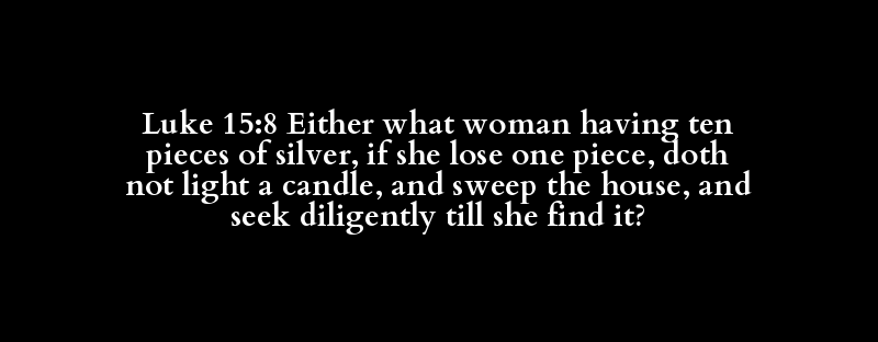 Luke 15:8 Either what woman having ten pieces of silver, if she lose one piece, doth not light a candle, and sweep the house, and seek diligently till she find it?