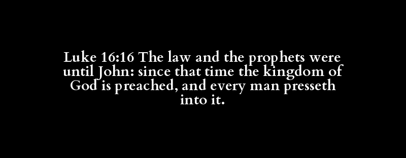 Luke 16:16 The law and the prophets were until John: since that time the kingdom of God is preached, and every man presseth into it.