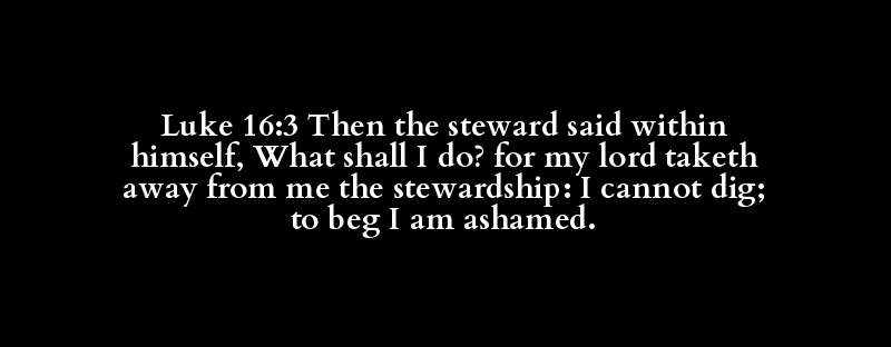 Luke 16:3 Then the steward said within himself, What shall I do? for my lord taketh away from me the stewardship: I cannot dig; to beg I am ashamed.