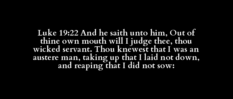 | [de] | [lego] | [autos] | [ek] | [sou] | [stoma] | [krino] | [se] | [poneros] | [doulos] | [eido] | [hoti] | [ego] | [eimi] | [austeros] | [anthropos] | [airo] | [hos] | [tithemi] | [ou] | [tithemi] | [kai] | [therizo] | [hos] | [speiro] | [ou] | [speiro] |
