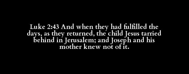 | [kai] | [teleioo] | [hemera] | [en] | [autos] | [hupostrepho] | [pais] | [Iesous] | [hupomeno] | [en] | [Hierousalem] | [kai] | [Ioseph] | [kai] | [autos] | [meter] | [ginosko] | [ou] |