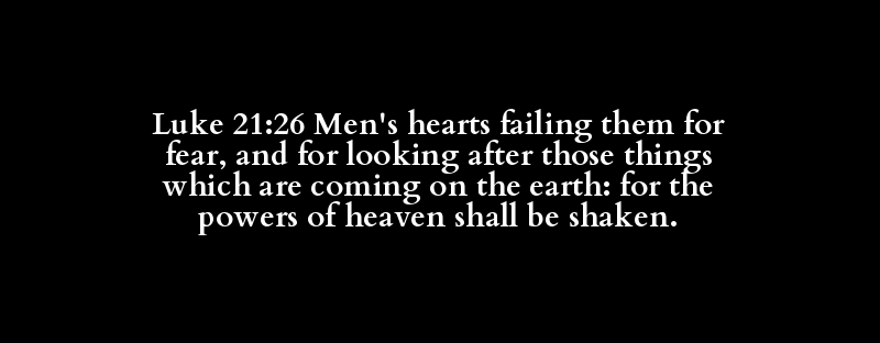 Luke 21:26 Men's hearts failing them for fear, and for looking after those things which are coming on the earth: for the powers of heaven shall be shaken.