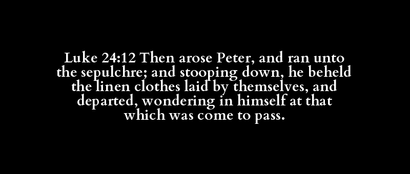 Luke 24:12 Then arose Peter, and ran unto the sepulchre; and stooping down, he beheld the linen clothes laid by themselves, and departed, wondering in himself at that which was come to pass.
