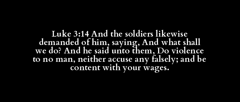 Luke 3:14 And the soldiers likewise demanded of him, saying, And what shall we do? And he said unto them, Do violence to no man, neither accuse any falsely; and be content with your wages.