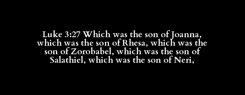 Luke 3:27 Which was the son of Joanna, which was the son of Rhesa, which was the son of Zorobabel, which was the son of Salathiel, which was the son of Neri,
