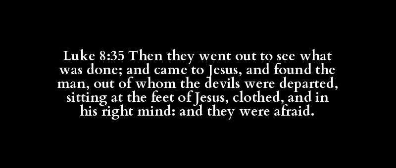 | [de] | [exerchomai] | [eido] | [ginomai] | [kai] | [erchomai] | [pros] | [Iesous] | [kai] | [heurisko] | [anthropos] | [apo] | [hos] | [daimonion] | [exerchomai] | [kathemai] | [para] | [pous] | [Iesous] | [himatizo] | [kai] | [sophroneo] | [kai] | [phobeo] |