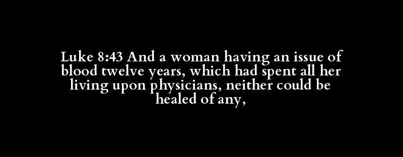 Luke 8:43 And a woman having an issue of blood twelve years, which had spent all her living upon physicians, neither could be healed of any,