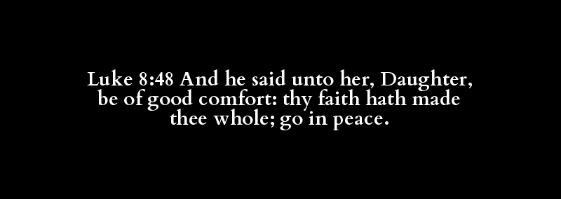 Luke 8:48 And he said unto her, Daughter, be of good comfort: thy faith hath made thee whole; go in peace.