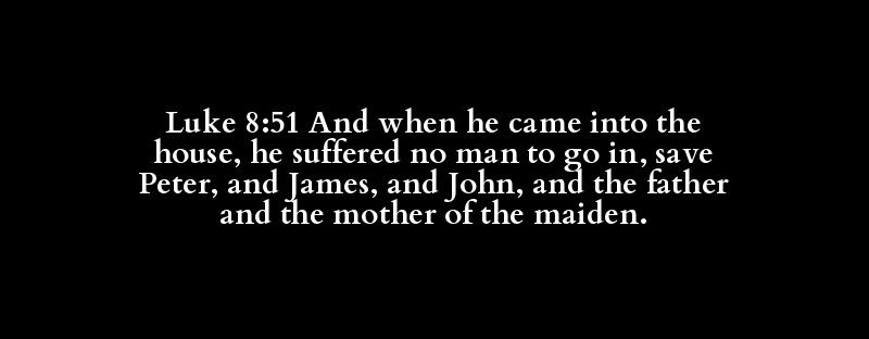 Luke 8:51 And when he came into the house, he suffered no man to go in, save Peter, and James, and John, and the father and the mother of the maiden.