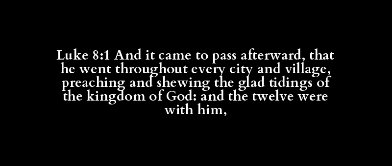 Luke 8:1 And it came to pass afterward, that he went throughout every city and village, preaching and shewing the glad tidings of the kingdom of God: and the twelve were with him,