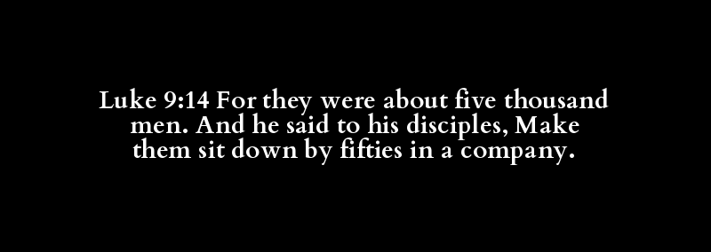 Luke 9:14 For they were about five thousand men. And he said to his disciples, Make them sit down by fifties in a company.
