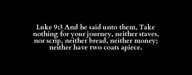 Luke 9:3 And he said unto them, Take nothing for your journey, neither staves, nor scrip, neither bread, neither money; neither have two coats apiece.