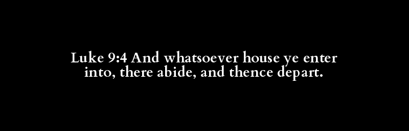 Luke 9:4 And whatsoever house ye enter into, there abide, and thence depart.