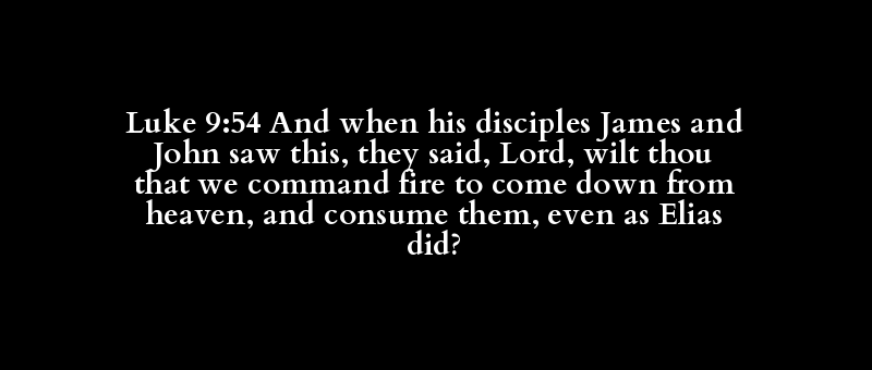 Luke 9:54 And when his disciples James and John saw this, they said, Lord, wilt thou that we command fire to come down from heaven, and consume them, even as Elias did?