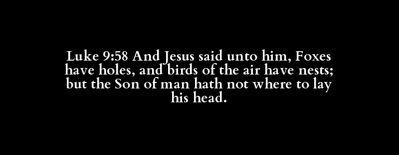 Luke 9:58 And Jesus said unto him, Foxes have holes, and birds of the air have nests; but the Son of man hath not where to lay his head.
