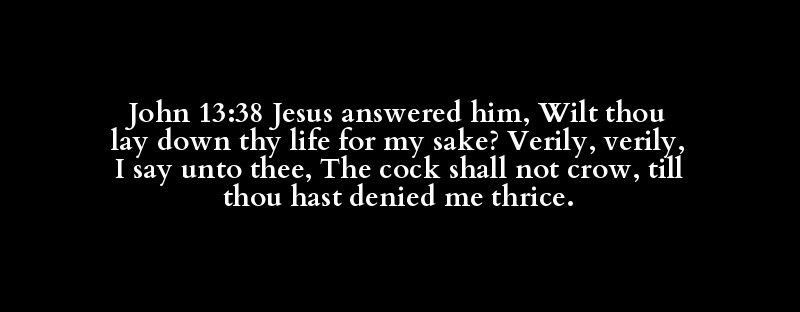 John 13:38 Jesus answered him, Wilt thou lay down thy life for my sake? Verily, verily, I say unto thee, The cock shall not crow, till thou hast denied me thrice.