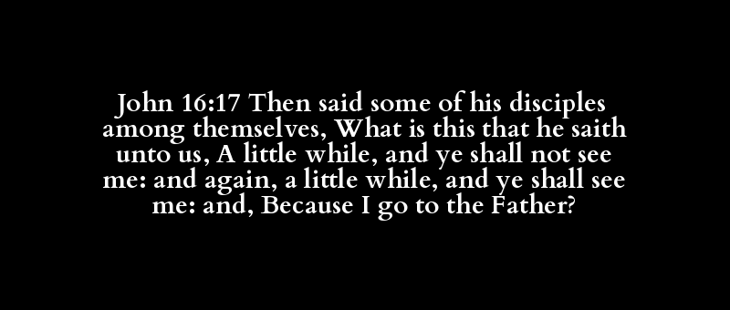 | οὖν | ἔπω | ἐκ | αὐτός | μαθητής | πρός | ἀλλήλων | τίς | ἐστί | τοῦτο | ὅς | λέγω | ἡμῖν | μικρόν | καί | θεωρέω | οὐ | θεωρέω | μέ | καί | πάλιν | μικρόν | καί | ὀπτάνομαι | μέ | καί | ὅτι | ἐγώ | ὑπάγω | πρός | πατήρ |